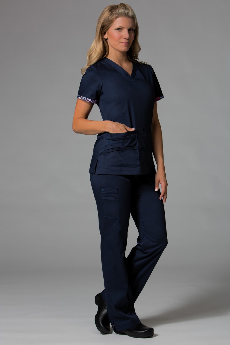 Scrub top made of material with an admixture of Lycra fibers is a flexible product, characterized by high quality and exceptional moisture absorption.