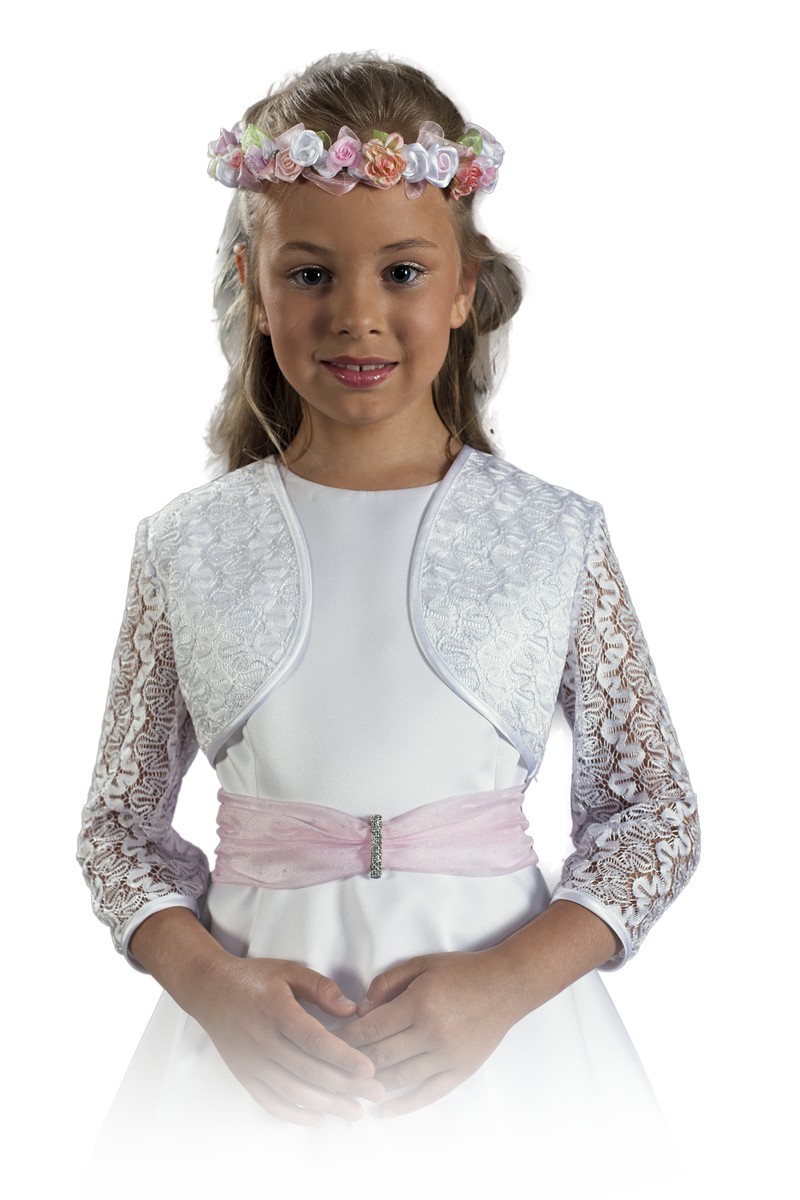 The bolero with lace is going to emphasize both the prettiness of your daughter and the innocence of being a child, who is just getting ready to get the first communion.