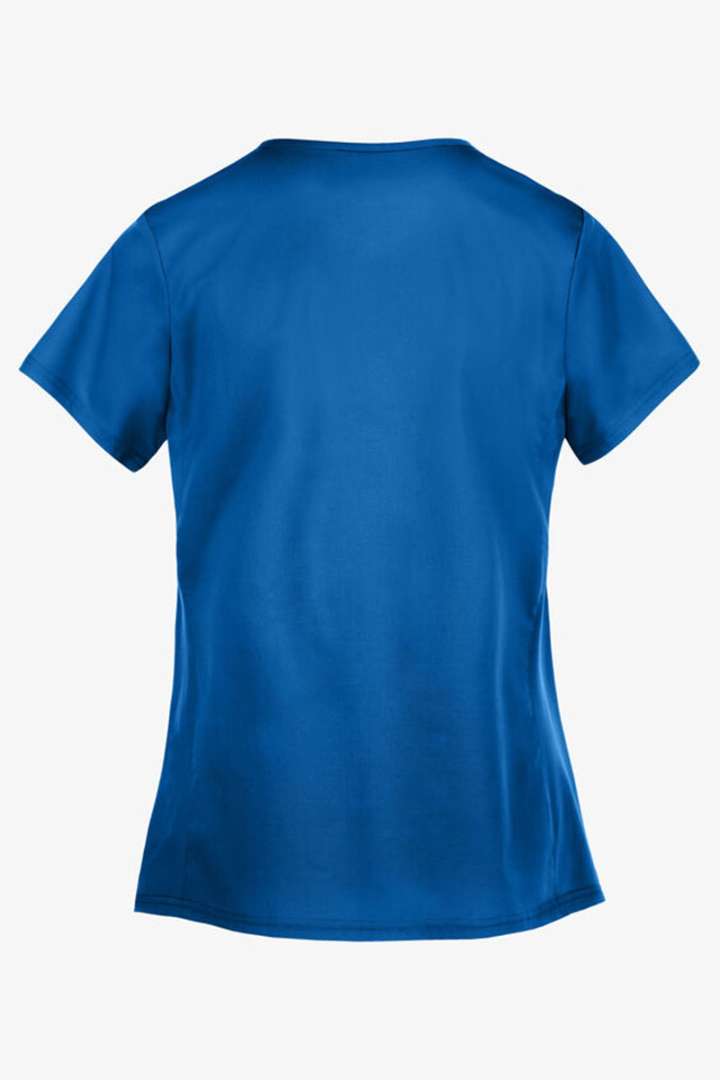 The high-low hem adds a stylish touch, and the scrub is available in a vibrant royal blue,