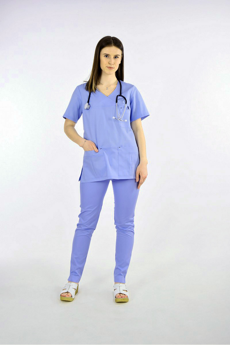 A lightly fitted women's scrub with a v-shaped neckline and functional pockets can hide small flaws of the figure.