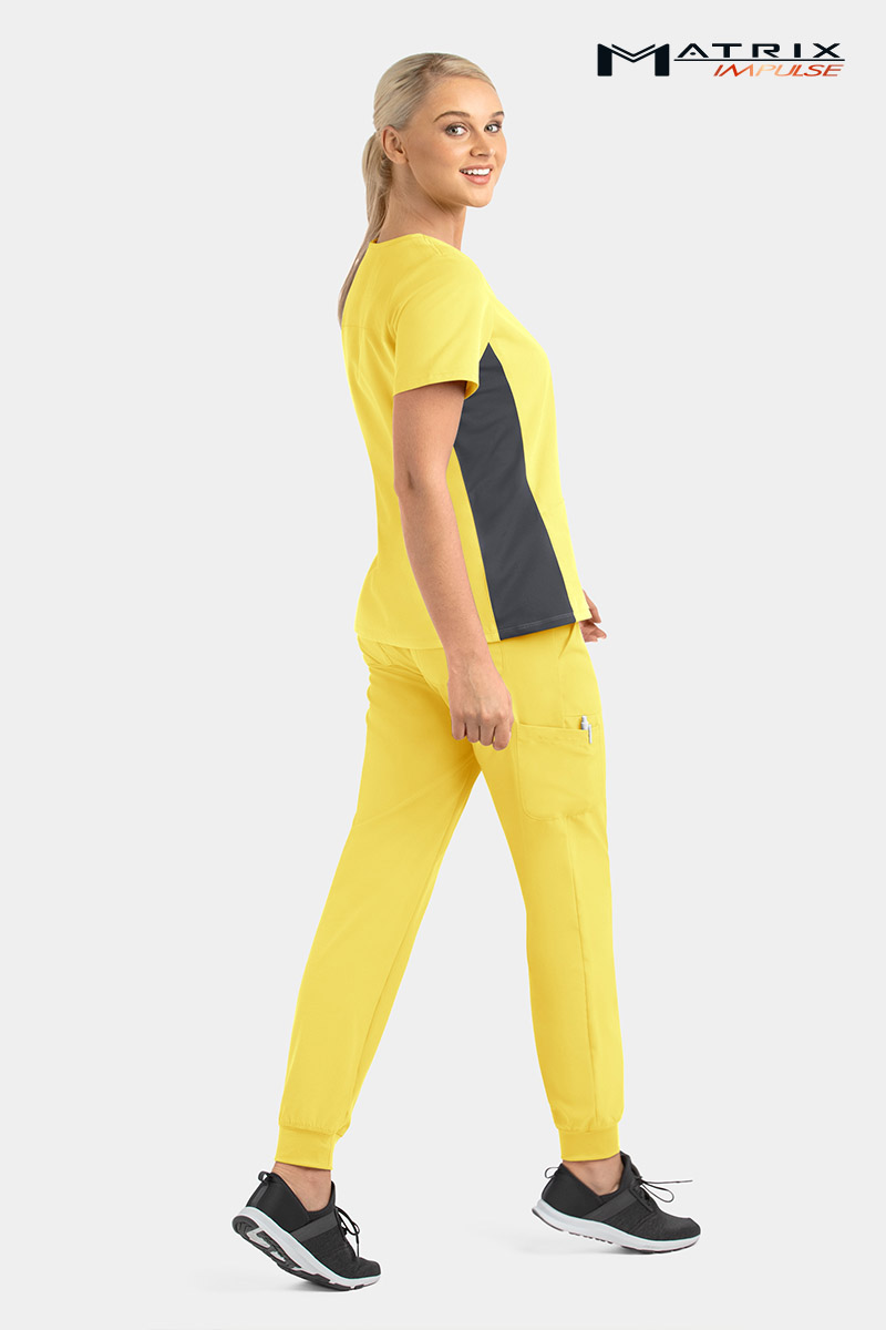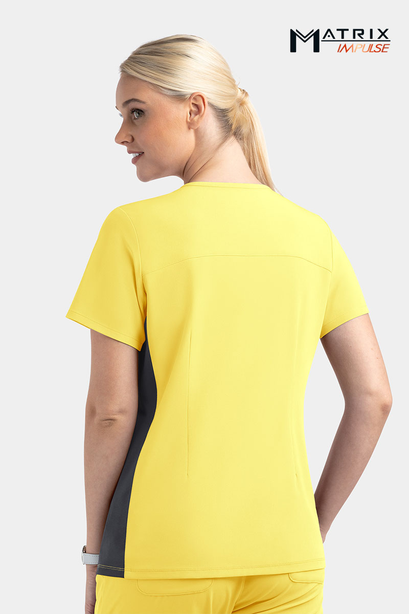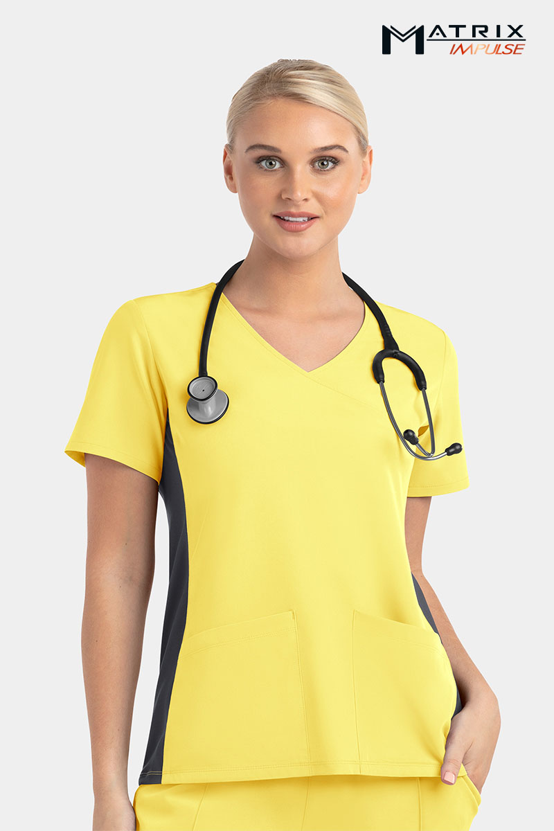 The Matrix Impulse sunshine yellow mock wrap scrub top is a great option for summer time.