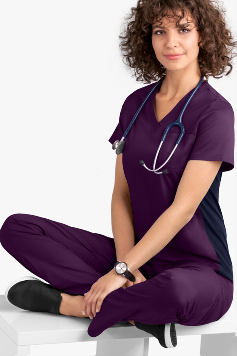 This purple medical top is a modern, stylish, and functional garment designed for healthcare professionals.