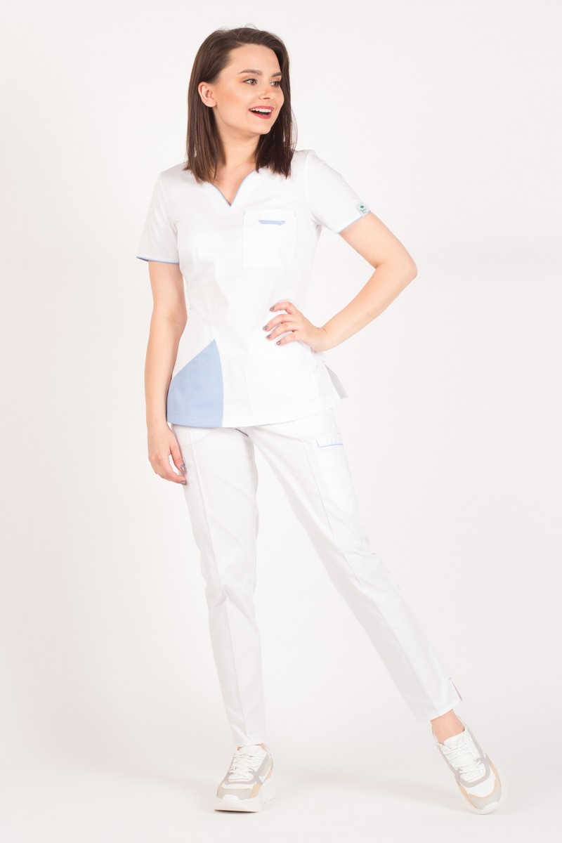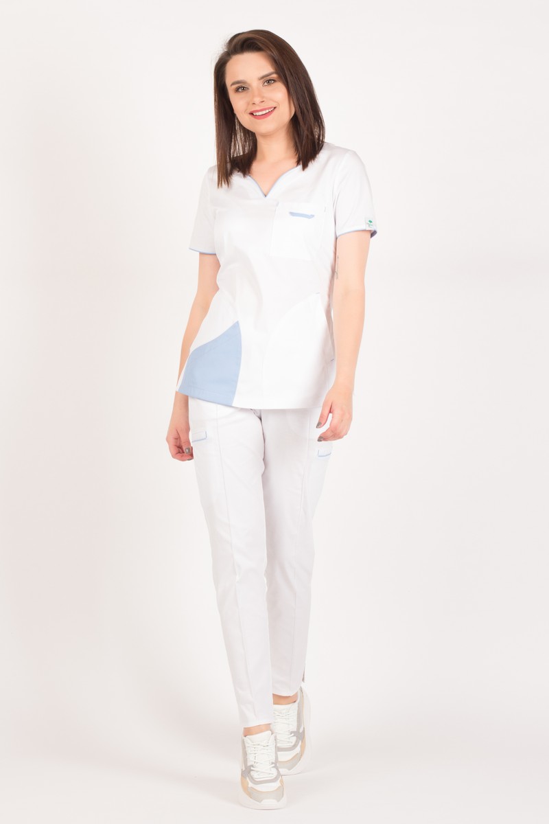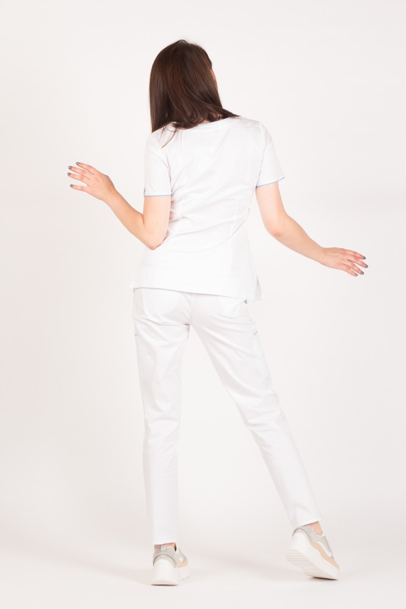 White medical scrub with blue trimming Fiona